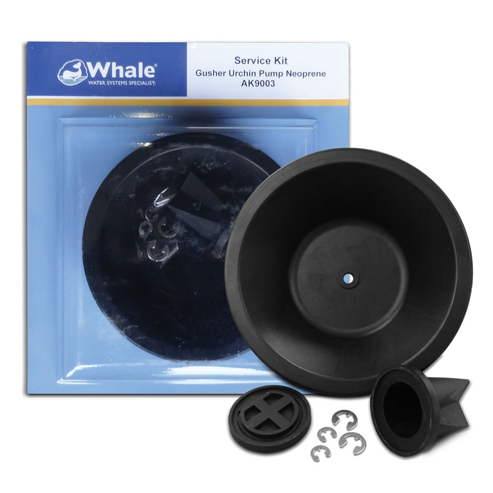 Original Whale Service Kit für die Gusher Urchin Handpumpe, bestehend aus 4 Sicherungsringen, einem Auslass- und einem Einlassventil und einer Neoprenmembran.