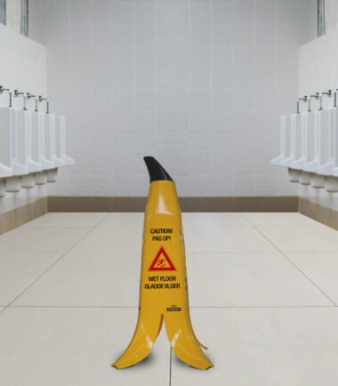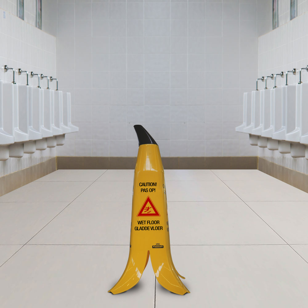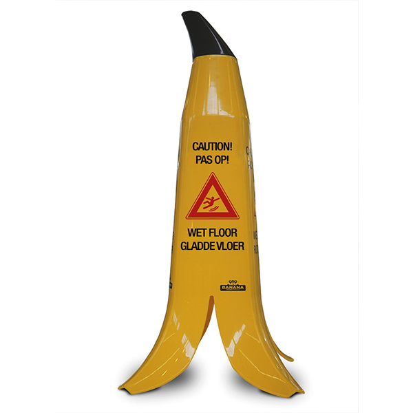 The original Banana Cone, in yellow plastic with a warning for a slippery floor.